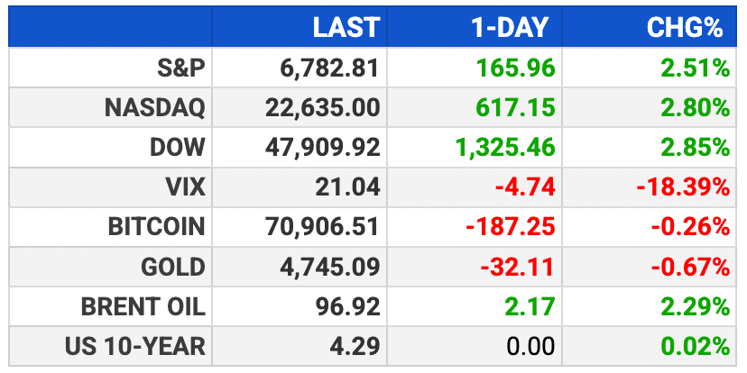 The Fast Five → Markets gorge on huge TACO, Vance to lead Iran talks as ceasefire violated, Bessent urges Congress to pass crypto bill, the president of Paramount steps down, and Deutsche Bank declares China energy 'winner'…