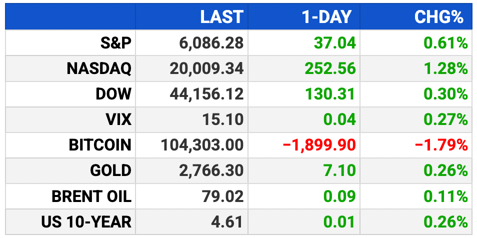 S&P 500 gained 0.61%, Nasdaq up 1.28%, Dow added 0.30%.
