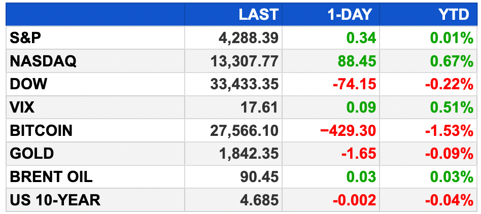 Dow down 0.2%, S&P 500 up 0.01%, Nasdaq up 0.67%.