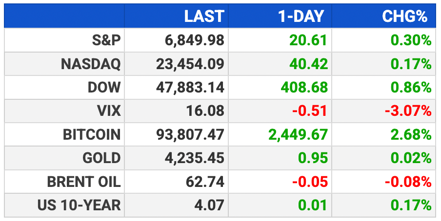 Stocks rose as weak ADP jobs (–32K) boosted Dec. 10 Fed-cut odds (~89%).
