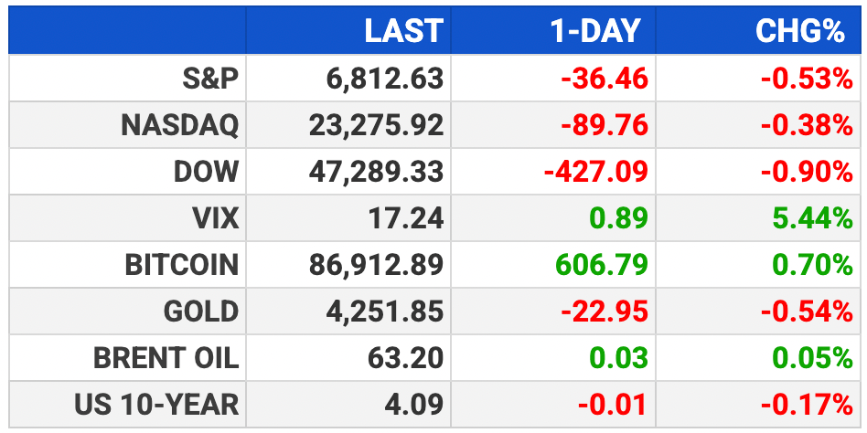 Crypto hit hard: bitcoin -6%, Coinbase/HOOD down; gold +, yields +.