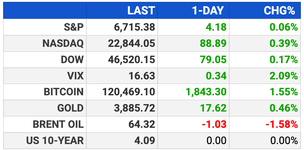 S&P 500 +0.06% (record), Dow +78 (+0.2%), Nasdaq +0.4%.